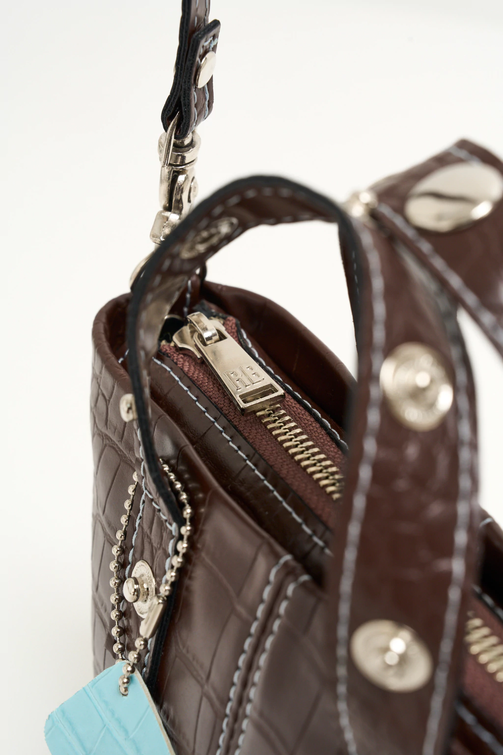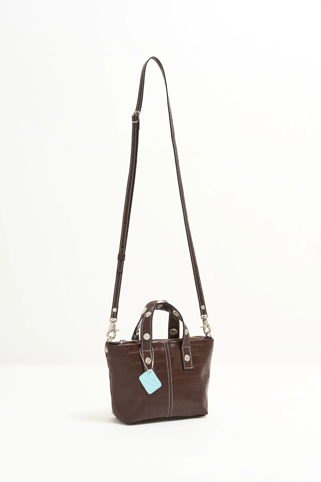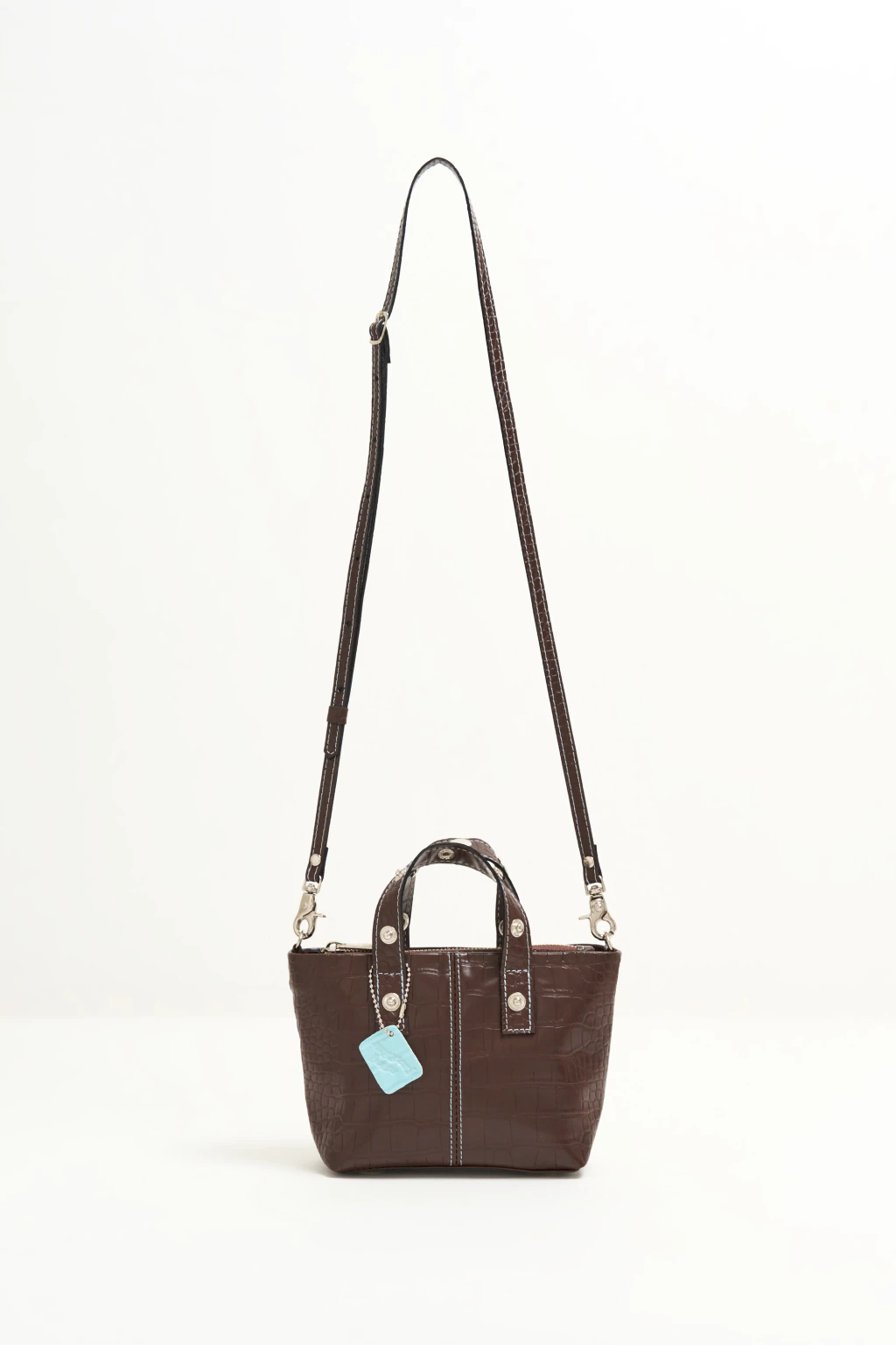 Nuestra Bandolera Mini Ola está confeccionada cuero sintético croco chocolate. Los detalles se apoderan de esta RB! Las costuras del frente son a contratono en celeste, dándole un toque distintivo, lo mismo con el logo :) La correa es regulable y desmontable con mosquetones niquel. La apertura es con cierre metálico ykk y en su interior incluye tarjetero :)