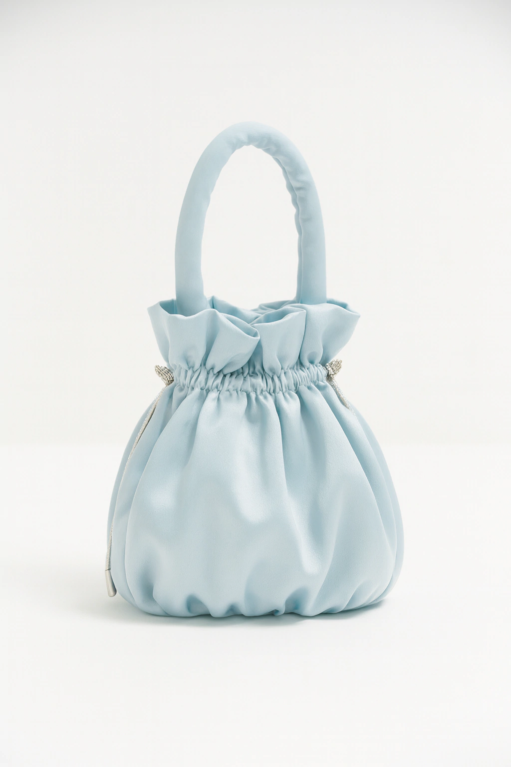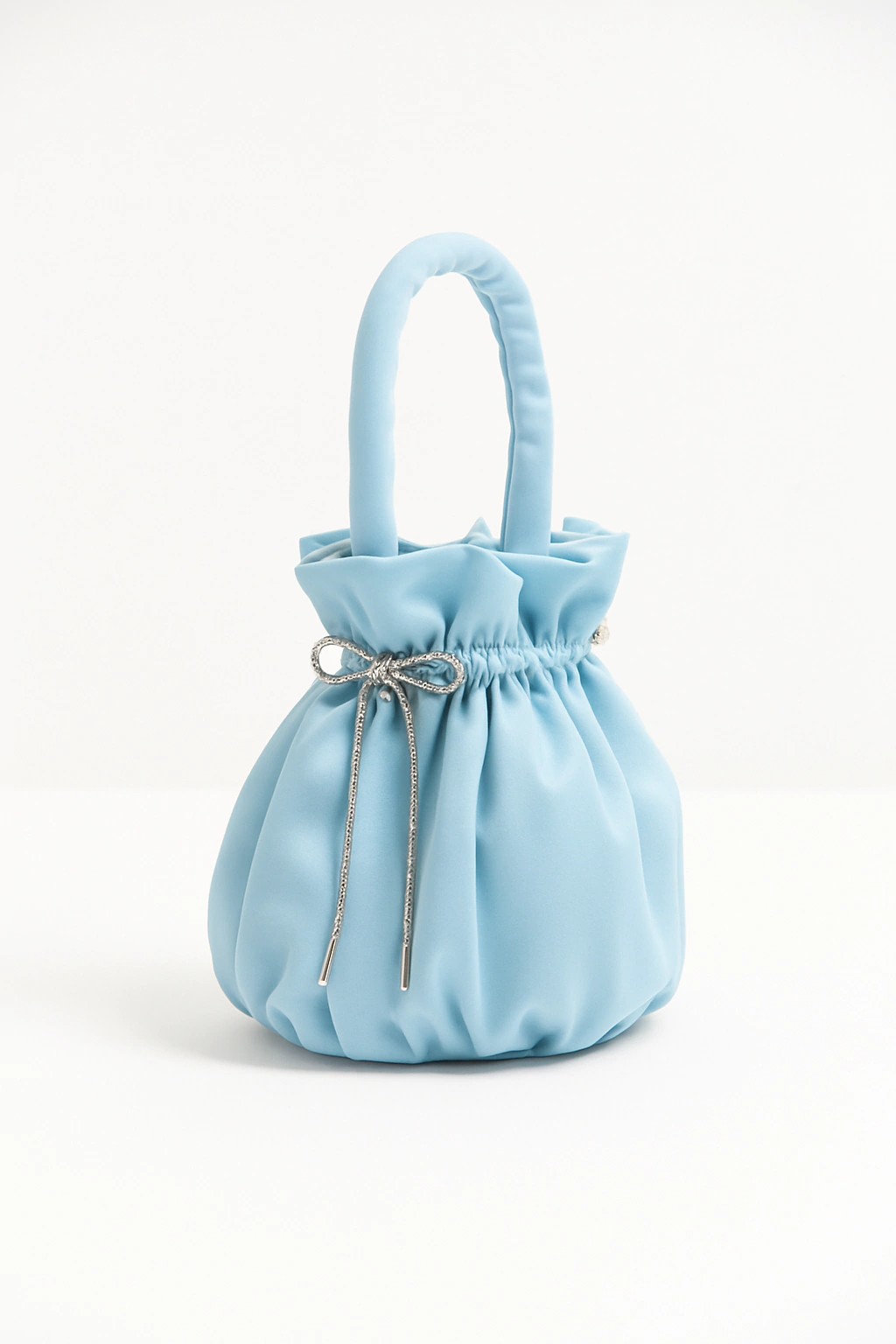 Cartera confeccionada en satén celeste, con manija fija y cortita a tono. En cada lateral tiene un moño de strass con terminales níquel. Apertura con elástico que genera amplitud y diseño en la cartera.