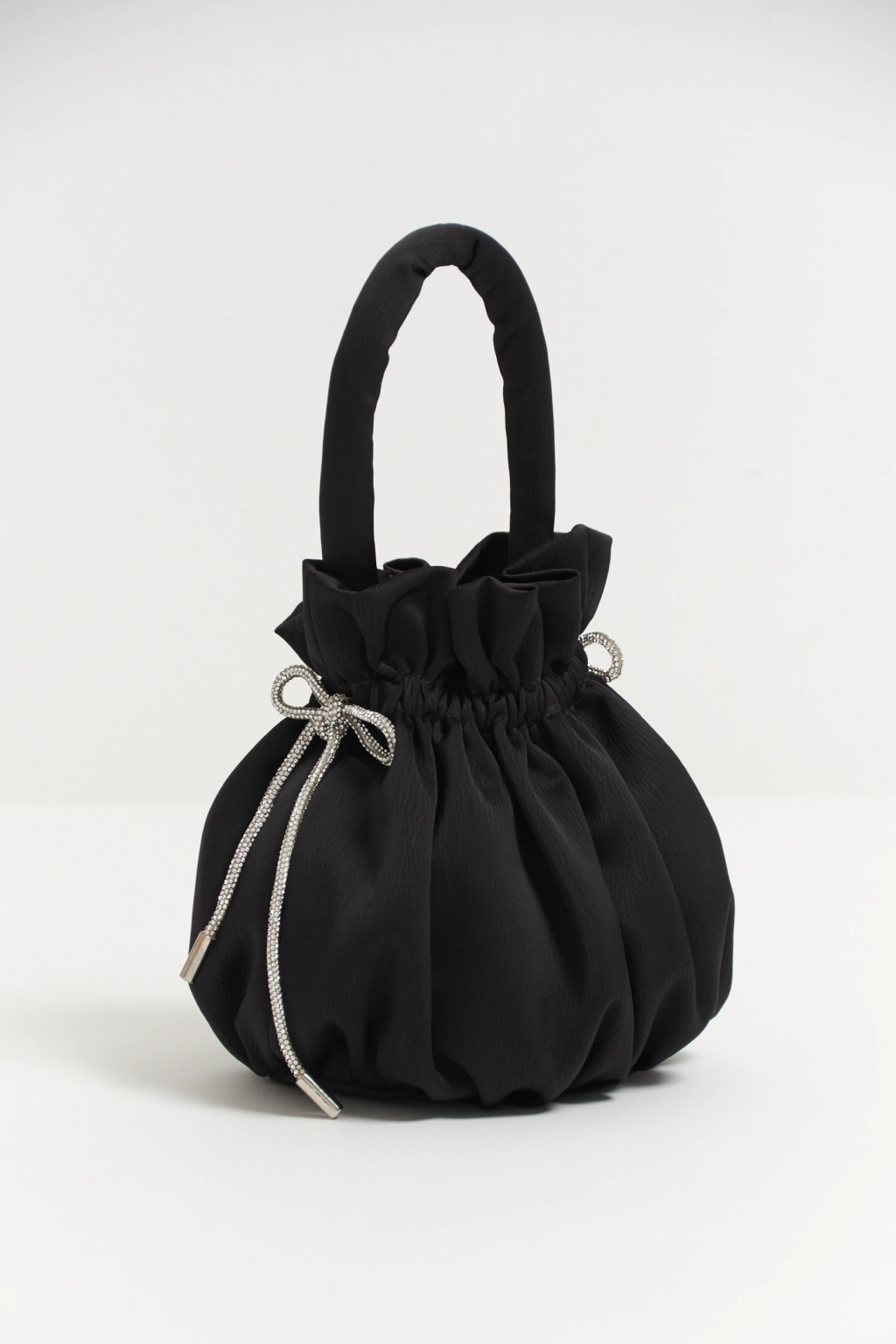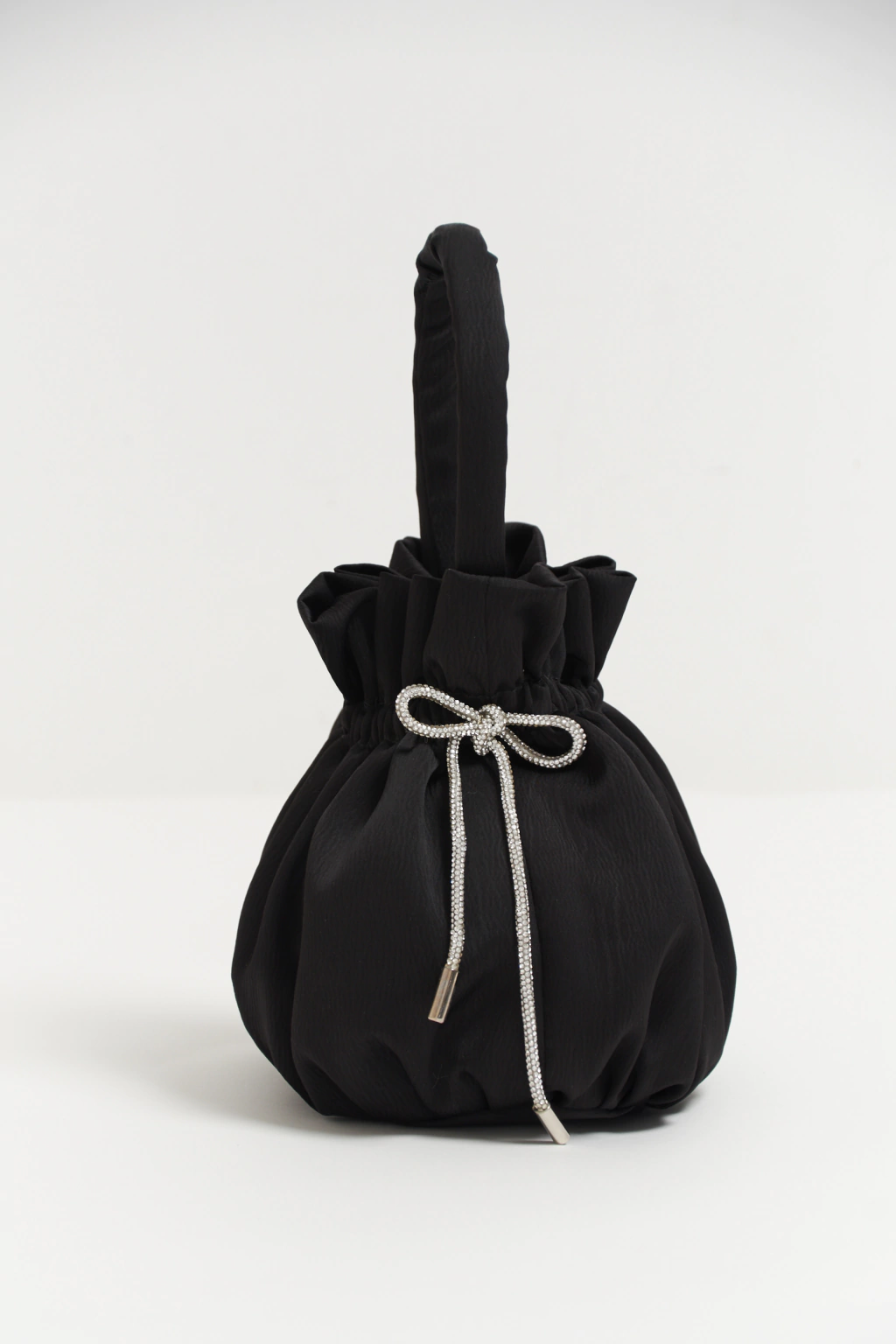 Cartera confeccionada en satén negro, con manija fija y cortita a tono. En cada lateral tiene un moño de strass con terminales níquel. Apertura con elástico que genera amplitud y diseño en la cartera.